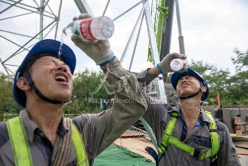 1.2020年8月18日,在安徽省合肥市瑶海区的220千伏屏显输变电工程组塔工地,安徽送变电工程有限公司施工人员在高空中冒着高温进行铁塔安装施工。连日来,安徽合肥地区持续高温天气,被称为守护光明“蜘蛛侠”的电力工人挥洒汗水,攀爬在铁塔上、电线间......他们战高温、保供电的脚步日夜不停歇。(郑贤列/人民图片)