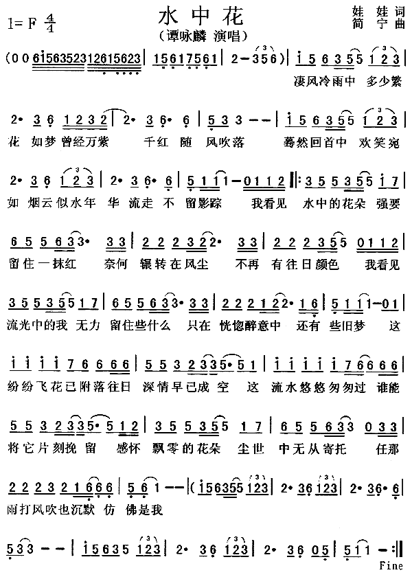 《水中花》是谭咏麟演唱的一首歌曲,由简宁作曲,刘以达编曲 ,分粤语、普通话两个版本,粤语版由简宁填词,收录在谭咏麟1988年8月18日由环球唱片发行的粤语专辑《拥抱》中 ;普通话版由娃娃填词,收录在谭咏麟1988年9月27日由环球唱片发行的普通话专辑《心手相连》中 。 1991年,谭咏麟在中央电视台春节联欢晚会上演唱了该歌曲的普通话版本。是谭咏麟比较著名的歌曲,在1991年春节联欢晚会惊艳全国婉转动听的旋律为谭咏麟抒情歌代表作。